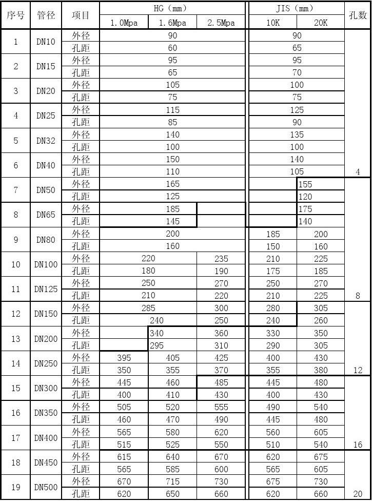 HG JIS法蘭外徑及孔距對(duì)應(yīng)表